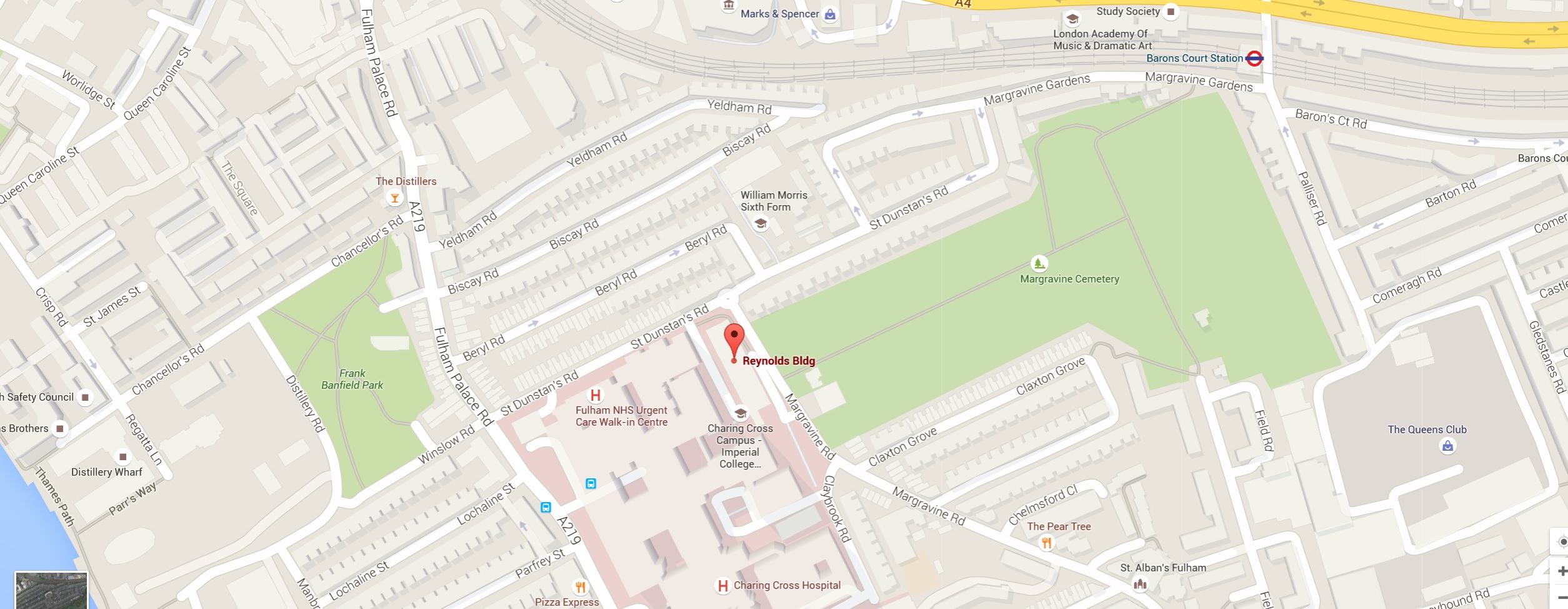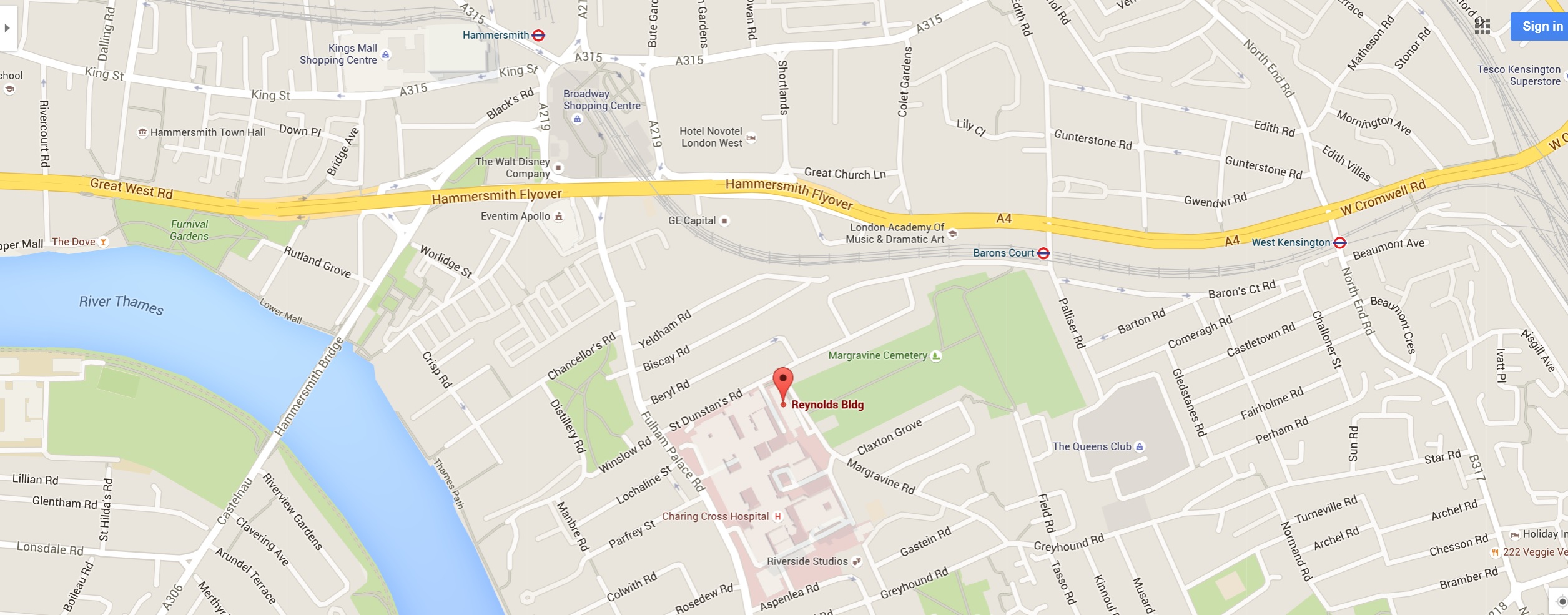 The closest tube is Baron's Court. Come out of the tube station, and turn right, and then walk through Hammersmith cemetery towards Charing Cross